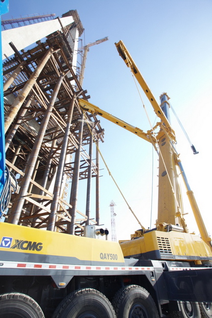 The esplanade bridge is located at the Jin Nan District in Tianjin, overcrossing Hai River. The whole bridge is comprised of three parts: the main bridge, south and north approach span with a full length of 2838 meters. It symbolizes the complete run-through of the south Tianjin part of the Tang-Jin Expressway. With its high quality and advanced technical capabilities, the heavy XCMG QAY500 bears the responsibility of main force in this engineering project. It perfectly fulfilled the lifting mission and is complimented as “the great contributor”.