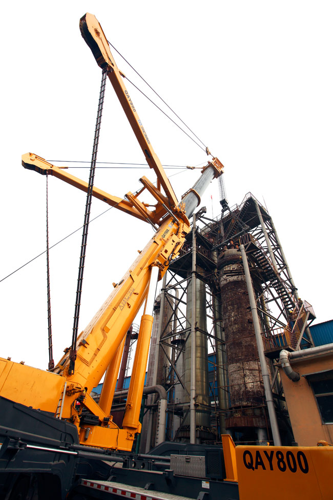 In second phase of a chemical plant renovation project undertaken by the Hebei Tuoli Company at the Industrial Park of Hebi city, coal mining capital in northern Henan province, one XCMG QAY800 performed a small miracle on June 1 with help from a XCMG QAY300.