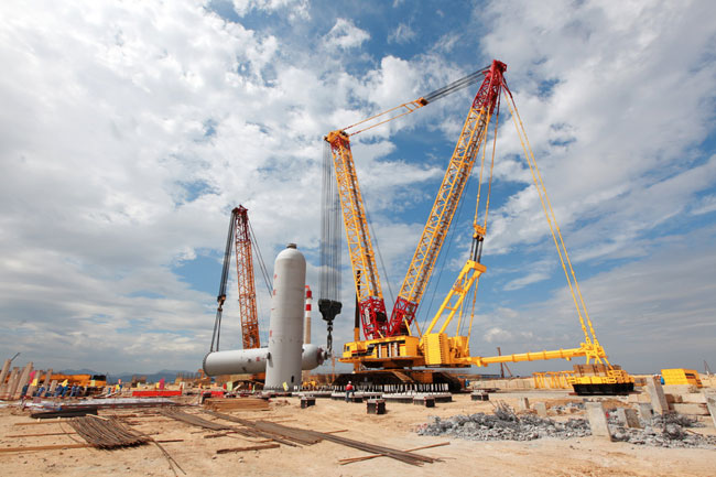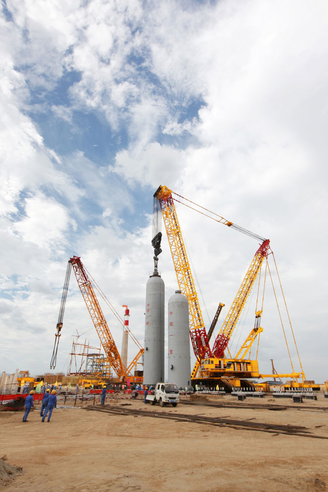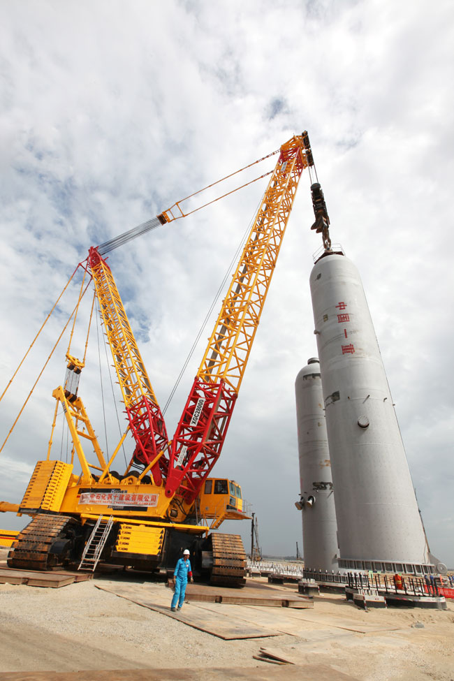 On August 1, mettlesome in bearing, a XCMG 2000-ton crawler crane entered the construction site of the Sinochem Quanzhou Huian 1200- ton/year refinery construction project (which was undertaken by the Tenth Construction Company of Sinopec), and worked in close cooperation with a Liebherr 750- ton crawler crane to hoist and put in place an approximately 4.5-meter- diameter and 8-meter-long residual oil first reactor (which weighs 740 tons), in spite of the site, wind, mid-summer heat and other adverse environmental constraints. Following the successful lifting operations conducted by the XCMG 2000-ton crawler crane for the petrochemical engineering projects in Wuhan, Hubei and Maoming, Guangdong, this hoisting operation in Quanzhou again turned out to be a strong evidence which demonstrated the strength and advantages of the XCMG 2000-ton crawler crane!