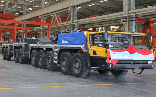 The biggest all-terrain crane chassis QAY1600 has just been successfully launched at XCMG, marking a new height of China’s R&D and production ability in super heavy all-terrain crane chassis. QAY1600 is equipped with a self-made 9-bridge system, a high-performance hydro-pneumatic suspension system, and an all-wheel drive multi-mode Electro-Hydraulic Power Steering (EHPS), enabling it to perform pivot-turn and crab hydraulic steering, with higher mobility. The use of multiple-bridge driven technology on QAY1600 provides greater power, making it possible to practice heavy-duty drive and tough-terrain drive, with a maximum climbable gradient of 50%.