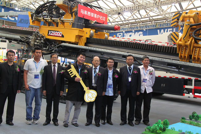 On 27-30 November, Shanghai New International Expo Center was bustling with noise and excitement. On the 1st day of the exhibition, a Malaysian client was attracted by XZ5000 horizontal directional driller displayed in Pavilion W3, and he placed a purchasing order on site. This horizontal direction driller with the largest tonnage in China will soon be “married” to Malaysia. At 10 am on 29th, XCMG held a special “wedding ceremony” for the horizontal direction driller. Mr Liu Jiansen, assistant to the president of XCMG Machinery and general manager of XCMG Import and Export Company presented a “golden key” to XZ5000 product to the “groom”, a Malaysian client.