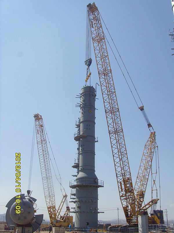 On the site, QUY 650-ton crawler crane was used as main crane while QUY 260-ton crane was designated for tail hoisting. These two cranes deftly drove and rotated on the construction site and exhibited their nimble and excellent performance against blue sky. For this hoisting task, XCMG’s QUY650 crawler crane undertook the tough task to complete hoisting operation of 11C1004 thermal regeneration tower tank that is 35m in net height, 5m in radius and 105t in net weight. The whole installation process lasted less than an hour.
