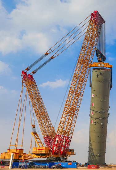 In July, sited at the Sinopec’s project site of an industrial park in Yantai, the world's first XGC88000 crawler crane made by XCMG, with its 108m heavy main boom and 22m fixed fly jib, favourably lifted a 1680-ton propane tower under the operating radius of 30m and rated load of 1,790 tons. After its perfect first show, XGC88000 was immediately disassembled and transported across half of China (more than 1600 km) to the construction site of 4 million tons/year indirect coal liquefaction project of Shenhua Ningxia.