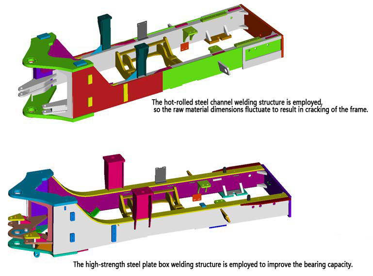 Rear frame improvement: The rear frame employs a high-strength steel plate box welding structure to replace the hot rolled channel steel welding structure, so that structural member cracking can be eliminated.