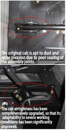 Cab airtightness: The cab airtightness has been comprehensively upgraded to avoid the defects of the original cab: the assembly joints are poorly sealed and the cab is apt to dust and noise invasion, so that its adaptability to severe working conditions has been significantly improved.