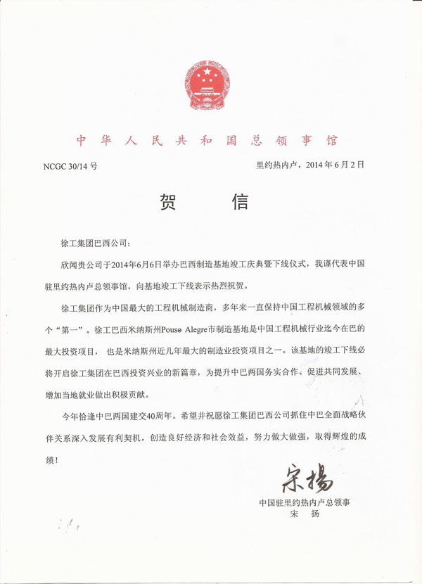It’s glad to hear that your Company will hold the Completion and Rollout Ceremony of the XCMG Brazil manufacturing base. On behalf of the Consulate-general of the People’s Republic of China in Rio De Janeiro, I herewith extend warm congratulations to the completion and off-line of the manufacturing base.