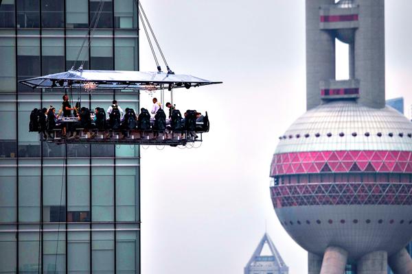 When dining, diners are tied to the safety seats with safety belts, and then hoisted to a height of 50 m. People at least 1.5 m tall are allowed, regardless of his/her age. Many onlookers exclaimed, “They are risking their lives to dine.” Reportedly, this grand banquet in the sky will be launched in other cities around the China.