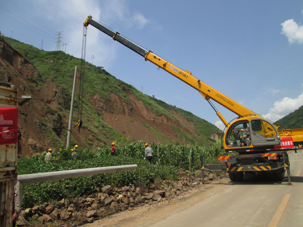 While being interviewed in the phone, Bian Yong, director of XCMG Xuzhou Heavy Machinery Co., Ltd.’s Office in Yunnan, disclosed further details. On the morning of August 7, thanks to two days of urgent repair and traffic control, the road that links Ludian County with the epicenter Longtoushan Township had been basically cleared, and the Armed Police Force Traffic Troop decided to let pass small-scale crane trucks. Meanwhile, the Command required China Southern Power Grid to swiftly complete mounting of several telegraph poles and transformer devices in Longtoushan Township. In view of the severe road condition, China Southern Power Grid decided to enroll in one XCMG QY12B.5 crane truck, which had been waiting beyond the traffic control line. In no time, XCMG 12t crane arrived at the operation site for the urgent repair.