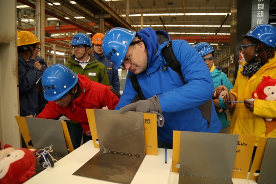 زار " طلبة XCMG تحت التجربة " بعد الظهر الى القاعدة الانتاجية للودرات الذكية الضخمة لمجموعة XCMG و التى تبلغ مساحتها 230 ألف متر مربع ، فما يبلث ان يتعدوا عتبة القاعدة حتى وجدوا ان شاشة العرض الالكترونية الضخمة تعرض لافتة ترحيب باللغة الانجليزية وصفوف افراد مجموعة XCMG المعبرة بصورتى " XIN XIN " و " RON RON " من الشخصيات الكرتونية مما يبعث فى نفوس هؤلاء الطلبة شعور بالدفء و الحنان فى اليوم الشتوى القارص . .