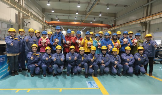 الصورة الجماعية بين " طلبة XCMG تحت التجربة " و عاملات " الجماعة النسوية المتحضرة لمقاطعة جيانغسو" فى حلقة تصنيع الواقيات المطاطية