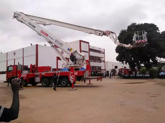 سيارة الإطفاء ذات منصة تسلق بطراز DG88 لمجموعة XCMG تشارك في مناورة إطفاء في أنغولا