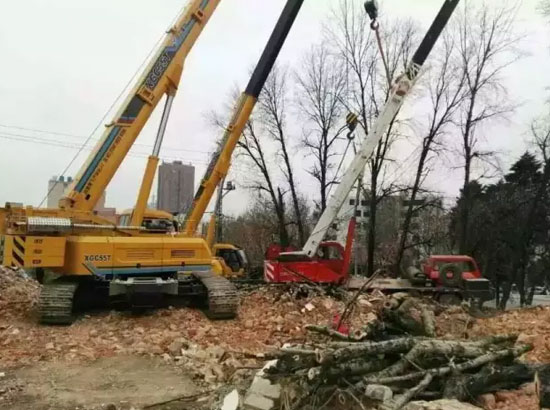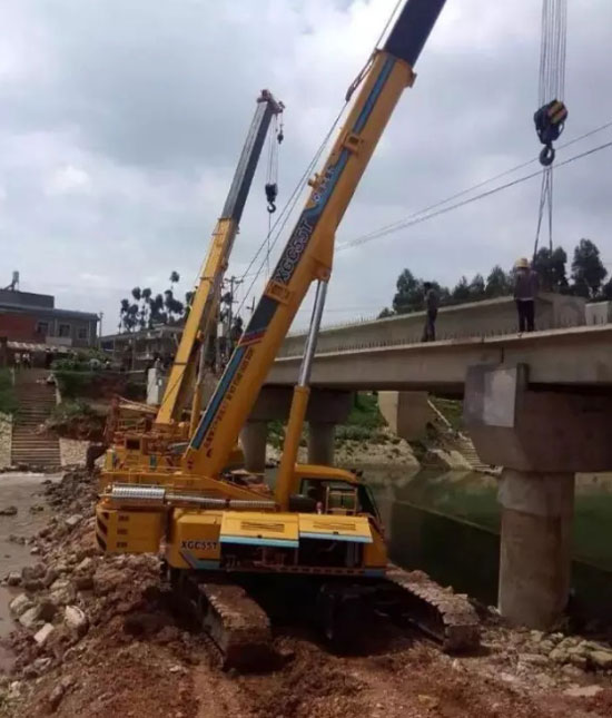 في موقع بناء في مدينة ناننينغ، حدثت حادثة تقلب رافعة على مستوى 25 طنا إلى الجانب خلال عمل البناء، ويرجع سببها إلى ظروف البناء السيئة حولها ولم تُضع الركائز بشكل ثابت. ومن حسن الحظ أن رافعتان مجنزرتان ذات ذراع التمديد والتراجع بطراز XGC55T لمجموعة XCMG قريبتان من موقع البناء، وتعاونت هتان الرافعتان لرفع الذراع الرئيسي وتعليق الخطاف، وسندتا الرافعة بسلالة، وبدأتا عملهما في عمل البناء المتوتر. وبعد ذلك، أعرب مسؤول المشروع، "بفضل الرافعة المجنزرة ذات ذراع التمديد والتراجع لمجموعة XCMG، لم نضيع وقت الإنقاذ وتكلفة الإنقاذ بسبب البيئة السيئة للبناء".