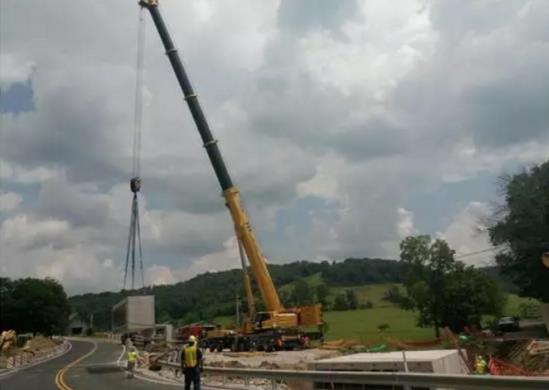 رافعة مجموعة XCMG بطراز XCA300U تشتغل في تركيب قطع أسمنتية مسبقة الصنع في منطقة Waynesburg الأمريكية