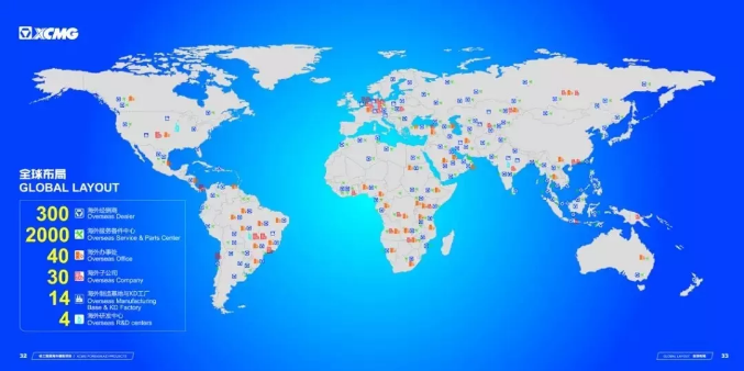 En la actualidad, los productos del XCMG se han vendido a 183 países y regiones, y se han establecido 5 centros de I + D en el extranjero por todo el mundo, 15 bases de fabricación en el extranjero y fábricas de KD. La exportación de productos en los países y regiones a lo largo de la "Iniciativa de Cinturón y la Ruta de Seda" ha representado el 70% del valor total de exportación del XCMG. Los productos del XCMG han cubierto 63 países y regiones a lo largo de la línea. En la actualidad, los productos del XCMG tienen la mayor participación de exportación en 30 países a lo largo de la "Iniciativa de Cinturón y la Ruta de Seda". La participación de las exportaciones en Kazajstán, Uzbekistán, Filipinas, Pakistán y otros países supera un 50%.