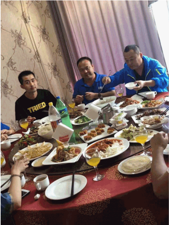Cena de reunión en el ultramar de unos 30 empleados de XCMG en algún proyecto en Tayikistán