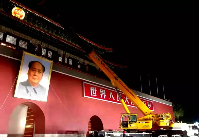 El 24 de septiembre, las grúas y automobiles participaron en el "nuevo" trabajo del retrato del presidente Sr. Mao en la Puerta de Tian´anmen.