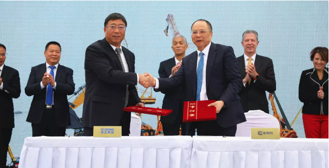 ▲ Lu Chuan, presidente de XCMG Machinery, y Liu Xiaoxing, vicepresidente de Cummins, firmaron un acuerdo en nombre de ambas compañías