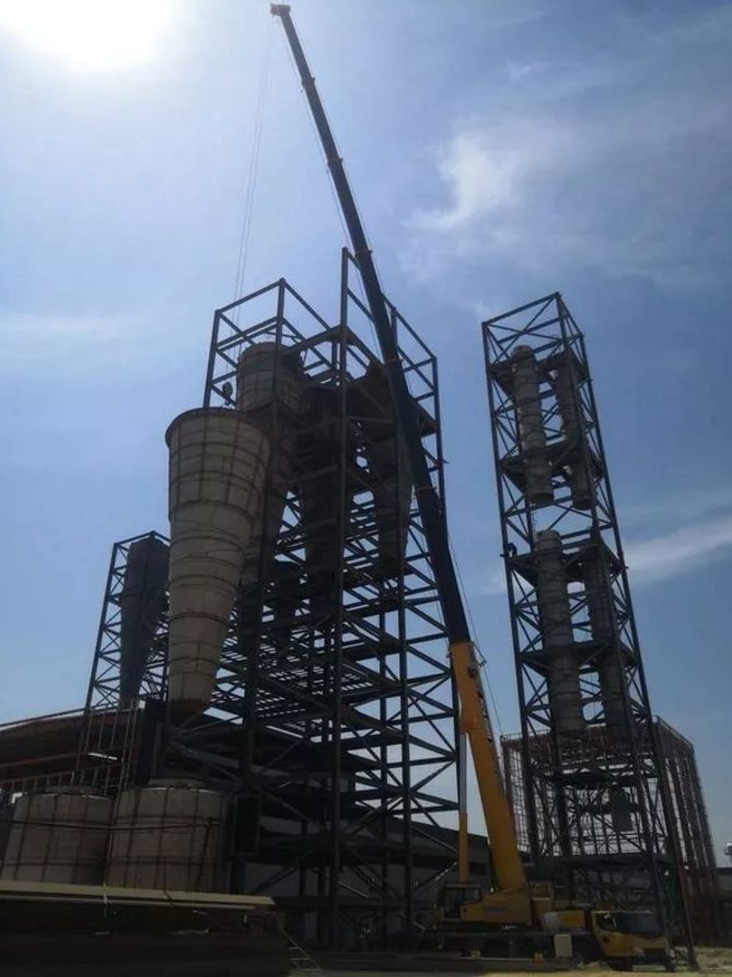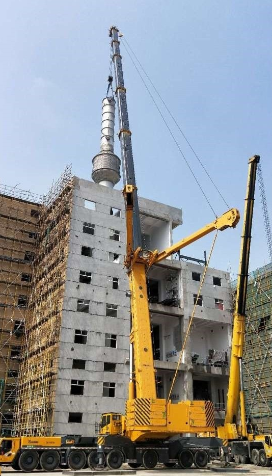 XCA220 está instalando el tanque de cemento cuidosamente en la planta de cemento de Anhui. La luz de fondo no puede obstacular la imagen bonita del gesto poderoso de la máquina.