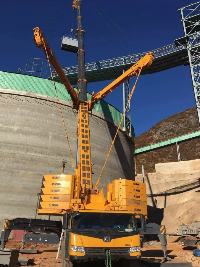 Bajo el cielo azul de Yunnan, XCA450 eleva la caja de 4-5 toneladas en la planta de cemento con una amplitud de elevación de 40 metros, y cumple la tarea de elevación de dificultad grande perfectamente.