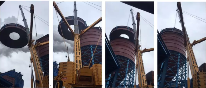 QAY650, junto con sus dos “hermanos” QAY500、QAY240, lucha en la tierra amplia de Zhungeer de Ordos para realizar la instalación del cilindro de vaciador de 180 toneladas y 88 metros de altura.