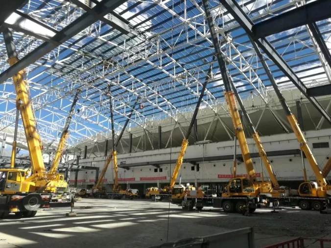 Recientemente, el proyecto de renovación del Centro de Convenciones y Exposiciones de Lhasa, edificio emblemático, entró en la fase del último impulso. La estructura del proyecto es una de marco de acero- muro cortante de hormigón armado y un techo de muro cortina de vidrio sostenido por puentes con entramado de acero hiperbólicos, que involucra el desmontaje de estructuras de acero y la construcción de muro cortina de vidrio curvado, entre otros aspectos. Hay muchos cruces interdisciplinarios, la construcción es difícil y el período vigente para la construcción es corto, lo que impone altos requisitos para la construcción del proyecto. En cuanto a la instalación de techo, 40 grúas de XCMG del mismo tipo levantaron sus brazos gigantes y completaron las tareas de elevación de manera segura y eficiente.