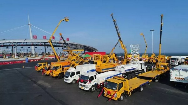 En abril de 2018, 6 camiones de amortiguación anticolisión, 2 vehículos de trabajo aéreos, 2 grúas de gran tonelaje, 2 barredoras, 1 grúa montada en camión y 1 pequeña cargadora entre otros equipos en juegos completos de alta gama de XCMG estaban bien arreglados, junto con el magnífico Puente Hong Kong-Zhuhai-Macao forman un hermoso paisaje.