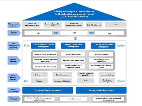 La Excavadora de XCMG introduce integralmente y empuja sistemáticamente la administración de fabricación precisa, rodeando en la cadena de valor compuesta por el proveedor, la Excavadora de XCMG y el cliente, se establece el sistema de administración de fabricación precisa compuesto por ocho sub-sistemas tales como la administración de flujo integral, administración de calidad integral, mantenimiento de fabricación integral etc., se establecen el sistema de evaluación y medición de rendimiento preciso incluyendo la calidad, seguridad, eficiencia, capacidad, mejoramiento así como el sistema de administración de placa visual.