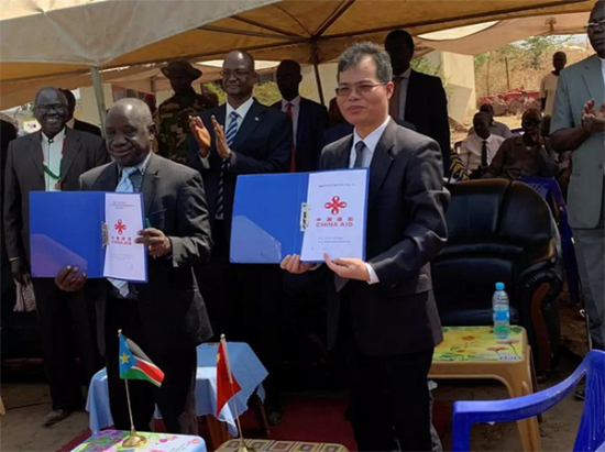 Firman el documento de entrega Mathew, viceministro de Agricultura de Sudán del Sur y Cai Senming, consejero comercial de la embajada.