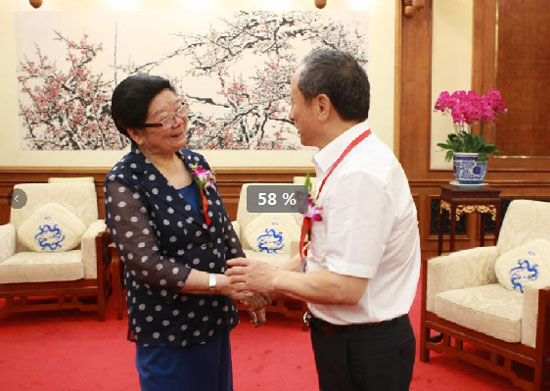 El vicepresidente del Comité Permanente del NPC, presidente honorario de la Federación de Economía Industrial de China, Gu Xiulian haciendo intercambios cordiales con el presidente, Wang Ming