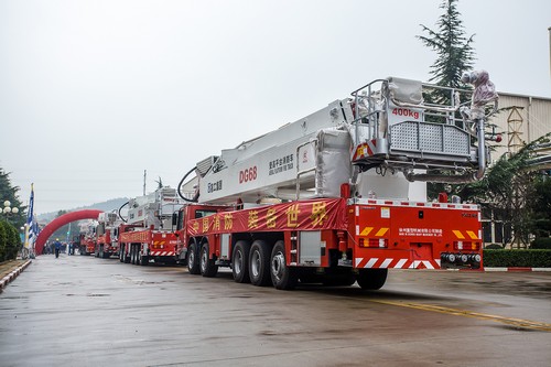 En el sonido ensordecedor de petardos, más de 300 trabajadores fijaron sus ojos de manera apasionada en los cuatro camiones de bomberos de plataforma de elevación que representan el nivel de ciencia y tecnología más alta en la industria de maquinaria de ingeniería de nuestro país cuando salían de la puerta de la planta, ellos subirían en el buque en el Puerto de Shanghái con el destino en Angola.