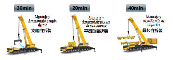 El montaje y desmontaje propio total es decir se realiza el montaje y desmontaje de alta eficiencia sin máquina auxiliar. Eso es un tema muy importante que estamos investigando. Actualmente XCA450 de XCMG ha realizado la función de montaje y desmontaje propio. A través de las tecnologías tales como el montaje y desmontaje de pies, montaje y desmontaje del contrapeso, montaje y desmontaje propio del superlift, con la premisa de garantizar la alta eficiencia de montaje, se ahorra el costo del equipo de elevación auxiliar para el cliente.