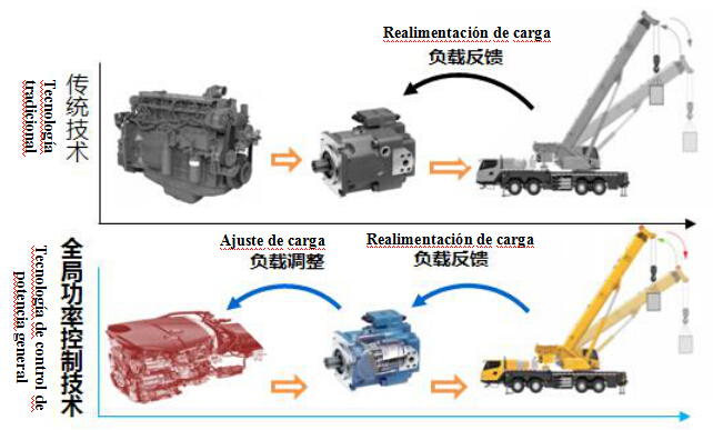 La tecnología de control de potencia general conecta el trabajo de grúa-motor-sistema de enlace del motor, se controla automáticamente el desplazamiento del motor de bomba y la velocidad de rotación del motor según el estado de trabajo de la grúa, garantiza que el motor funcione en ela zona de consumo de aceite mejor, hace que el consumo de combustible se reduzca por 10-15%. Para el cliente, se ahorra el costo del combustible.
