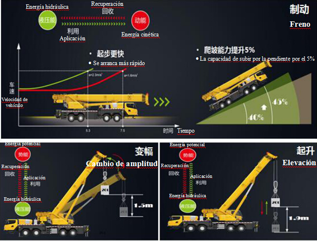 La combustión de la gasolina ofrece la fuerza motriz para la grúa, y durante este proceso se genera el desgaste no necesario. La tecnología de recuperación y reaplicación de la energía puede coleccionar, almacenar eficazmente la energía potencial generada por el freno, el cabrestante y el cambio de amplitud de la grúa y se la libera en el trabajo siguiente, con el fin de hacer el inicio, la subida por la pendiente, el cambio de amplitud y la elevación sean más eficiente.