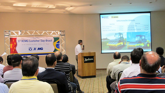 The New Product Promotion was held in a 5-star hotel in Victoria, at which more than 100 XCMG distributors and key accounts from all over Brazil were present. It started with a propaganda film of XCMG – "Long Voyage", and then proceeded with the introductions made by business personnel of XCMG Import-export Company and by the Brazilian XCMG distributors. The new products presented at the Promotion mainly included all-terrain crane, large-tonnage crawler crane, excavator, backhoe loader, fork loader and truck mounted crane. The distributor dealing in earth-moving machinery products made an introduction to XT870 backhoe loader, XT860-170 telescopic fork loader, and XE210 crawler excavator, which were all newly exported to Brazilian market. The crane distributor made an introduction to such new products as QY25K5-1, QY70K-1, QY90K and QY110K as well as QAY240, QUY150 and QUY260 that made their debut in Brazilian market. On the promotion there was an active interaction between business personnel and distributor and key accounts, who communicated with each other on the performance of such new products. Customers showed great interest to XCMG products for they were diversified in variety and complete in set, and they admired XCMG for its strength.