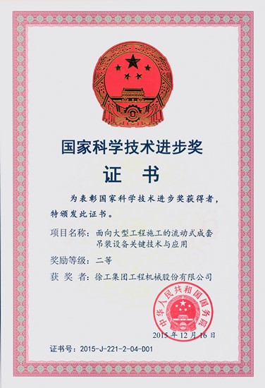 16 декабря Государственный совет награждал Премию естественных наук, Государственную премию технологических изобретений, Премию технического прогресса отечественной науки и Премию Международного научно- технологического сотрудничества. Проект «ключевая технология и применение крупномасштабных компктов проточного типа грузоподъемной техники для крупного строительства» XCMG выиграл премию второго класса годовой Государственной премии научно-технического прогресса, промышленности строительных машин является единственным наградами проекты.